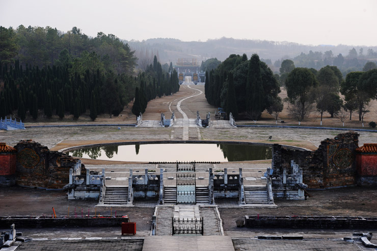 显陵神道从敕谕碑到祾恩门,呈蜿蜒形,全长1600米。是明代帝陵中唯一整体保留神路"龙鳞"做法的陵寝。中间铺筑石板谓之"龙脊",两侧以鹅卵石填充,谓之"龙鳞",外边再以牙子石收束,总称为"龙鳞神道"。这种做法既经济又美观,又能满足陵寝建筑的功能要求。